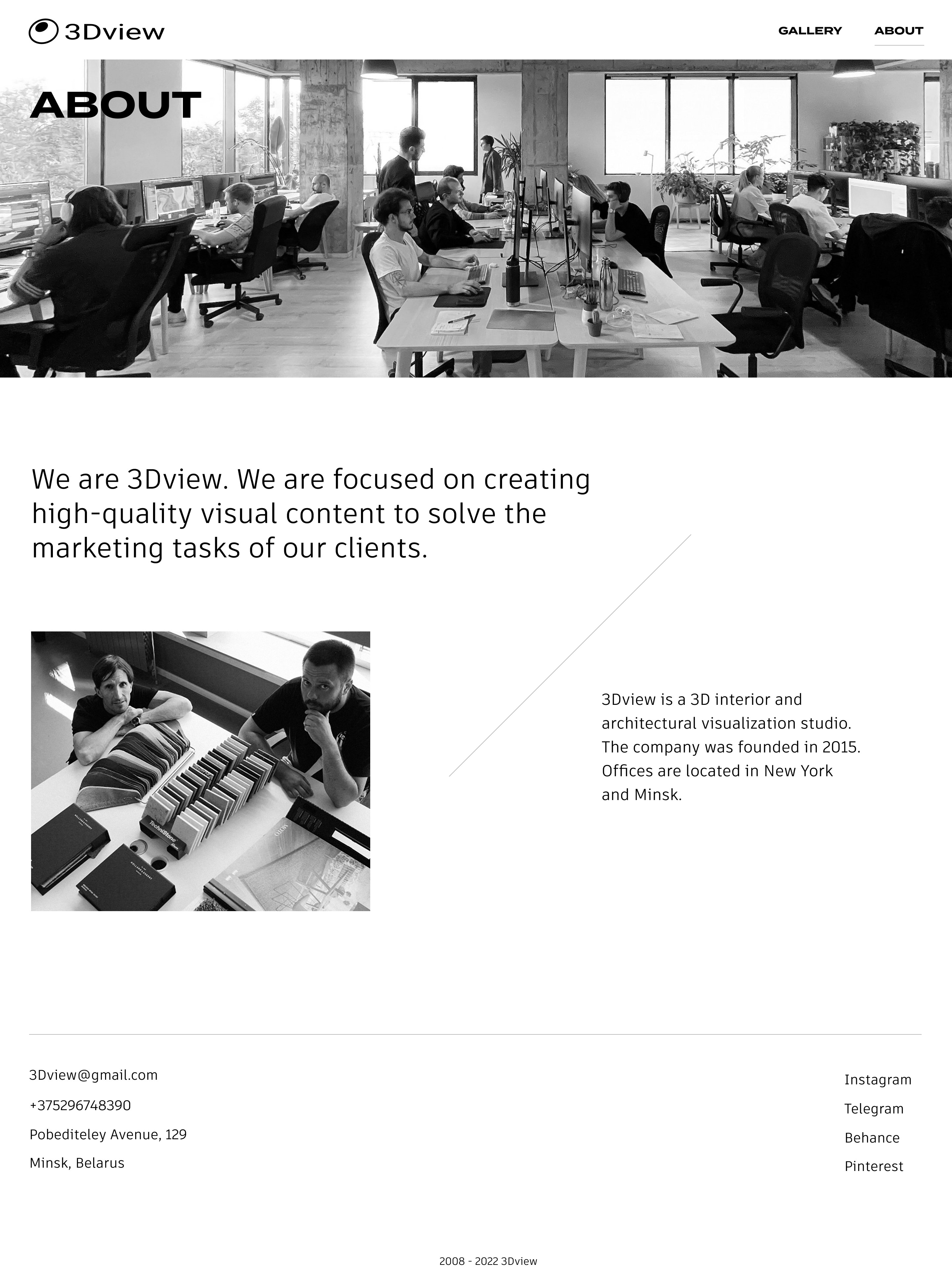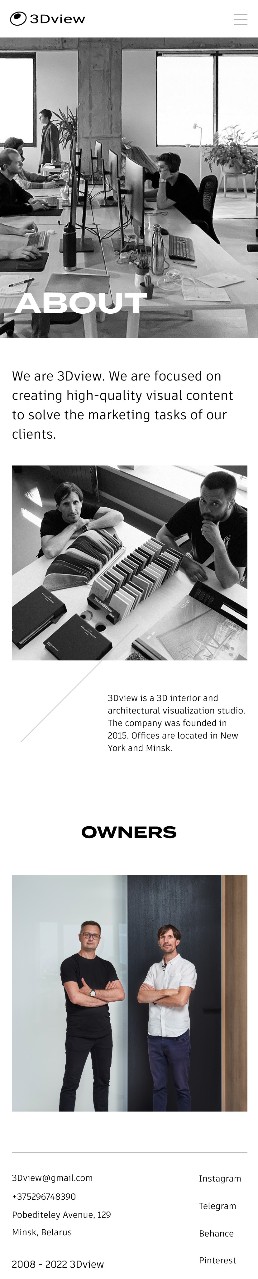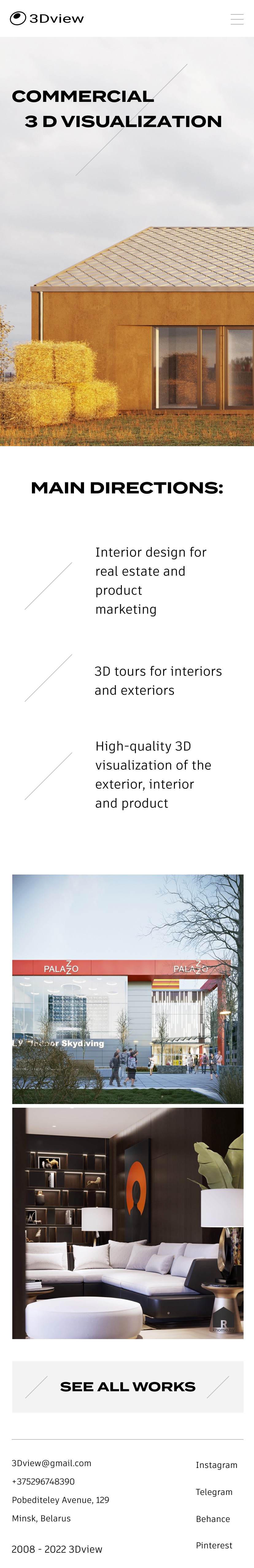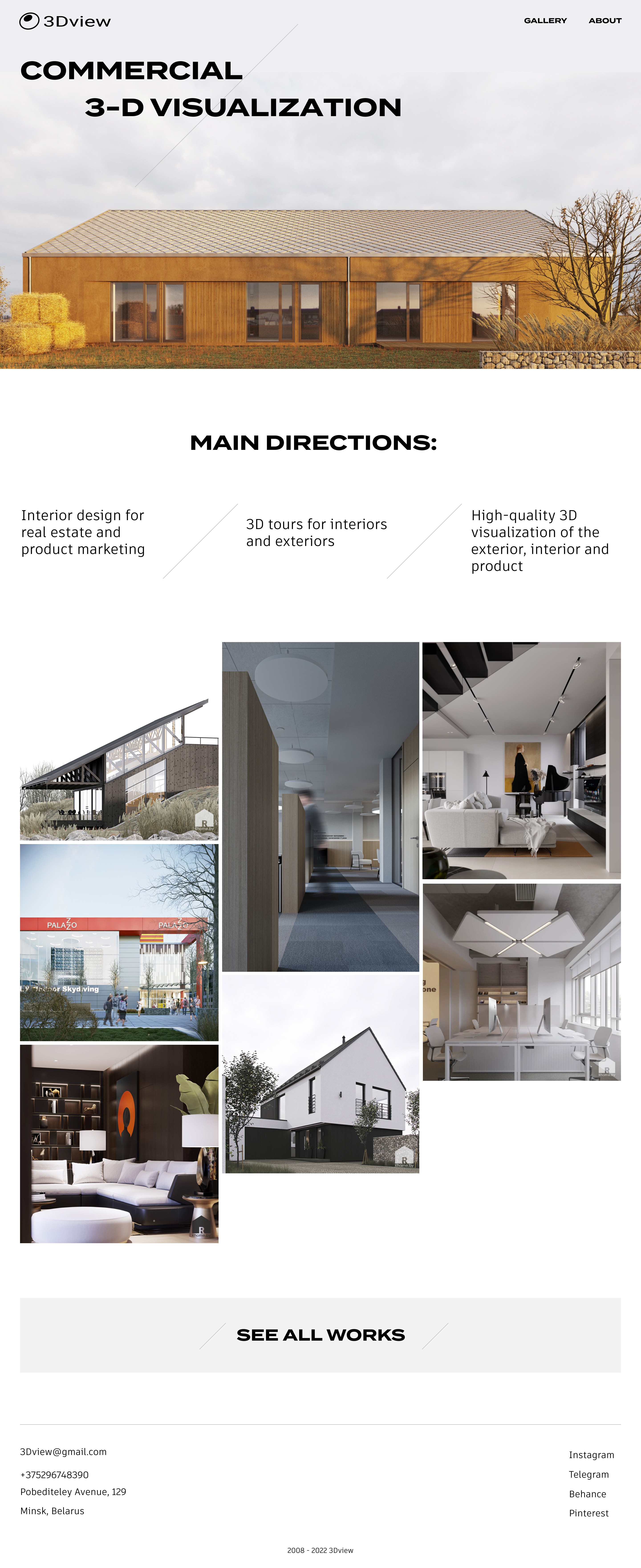 Сайт команды визуализаторов с опытом, которые работают с проектами по всему миру. Простая и адаптивная верстка сочетается с минималистичными визуальными приемами.