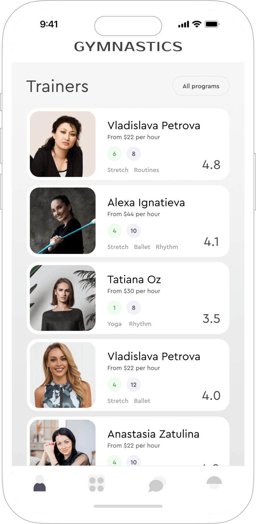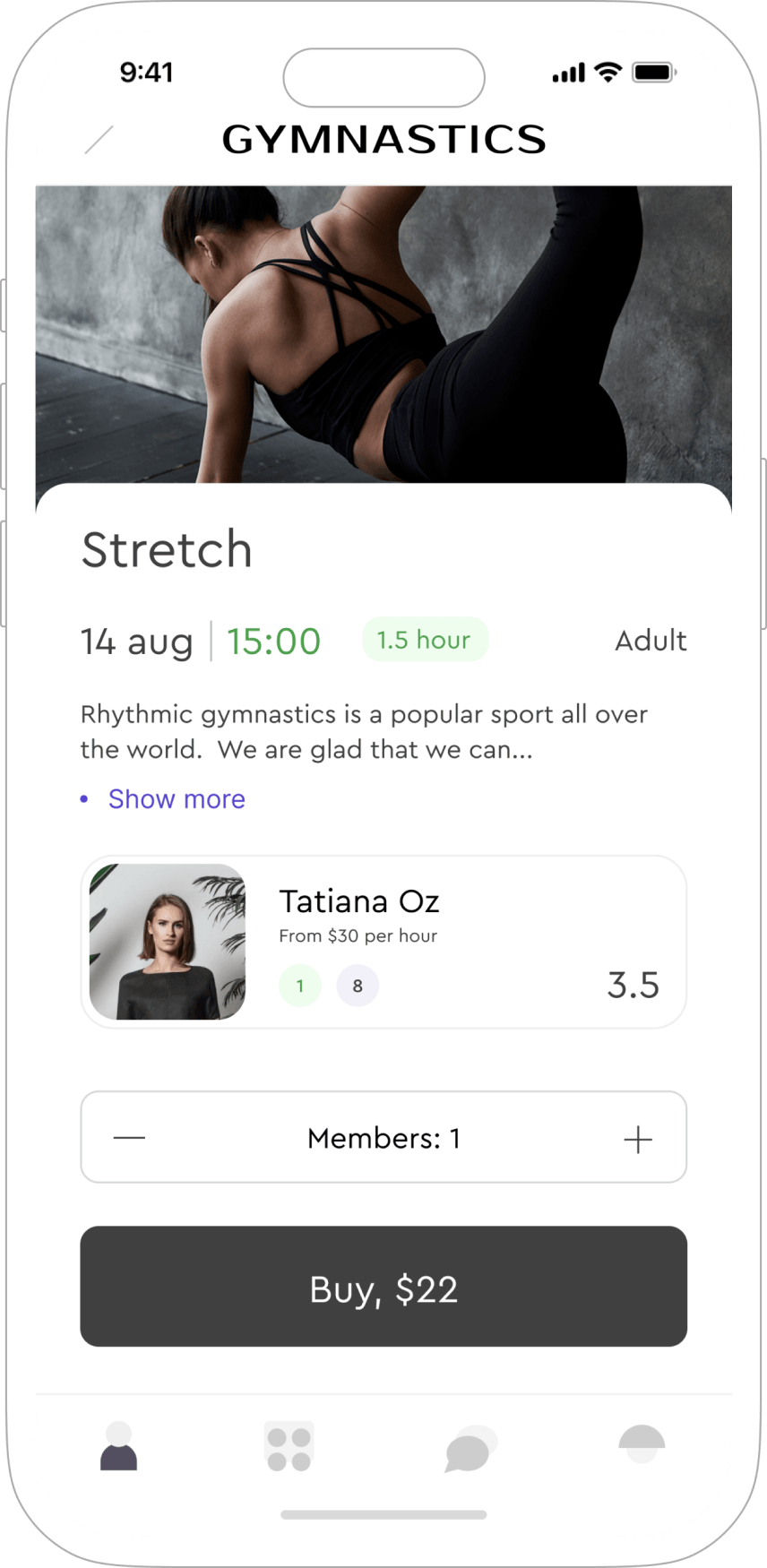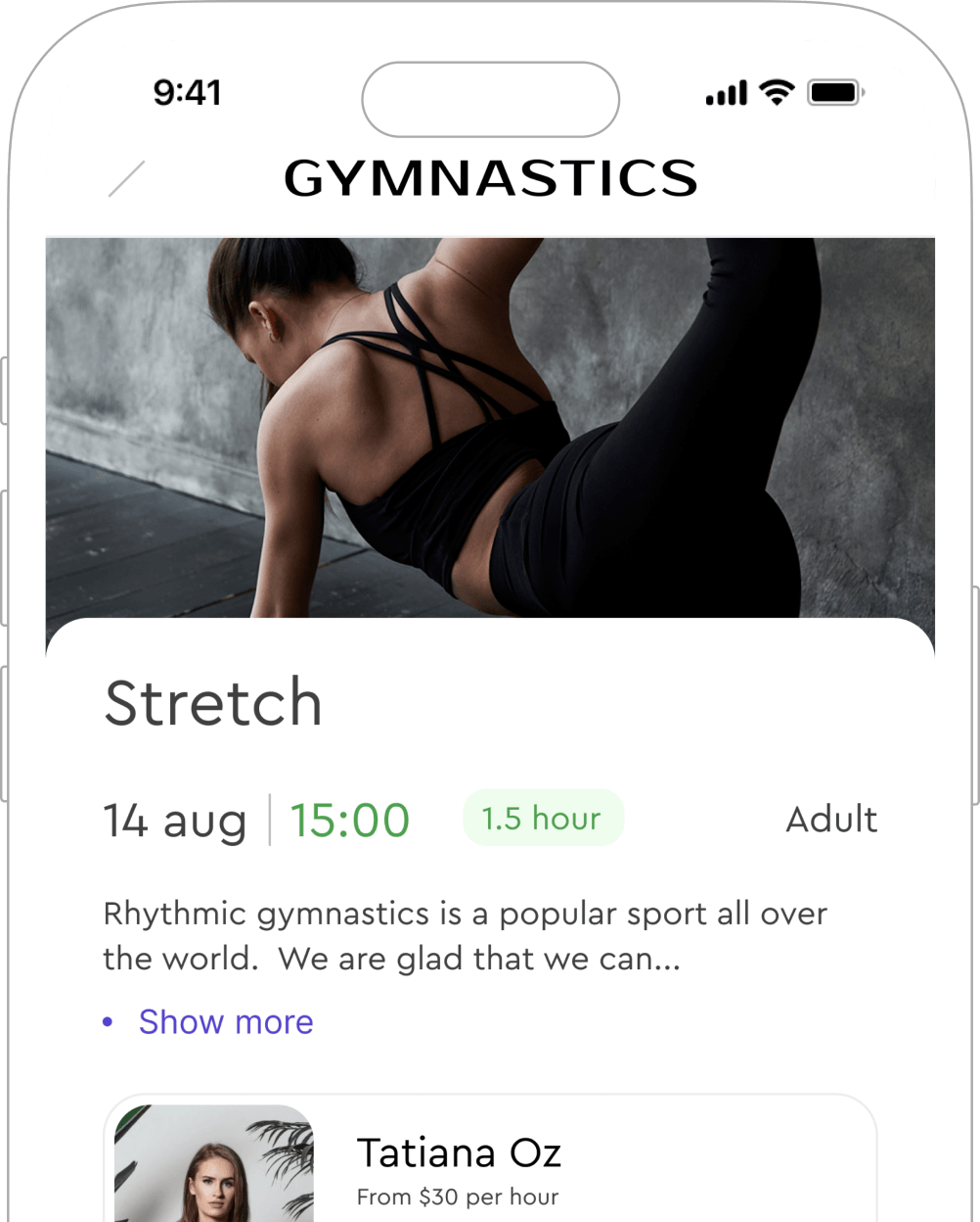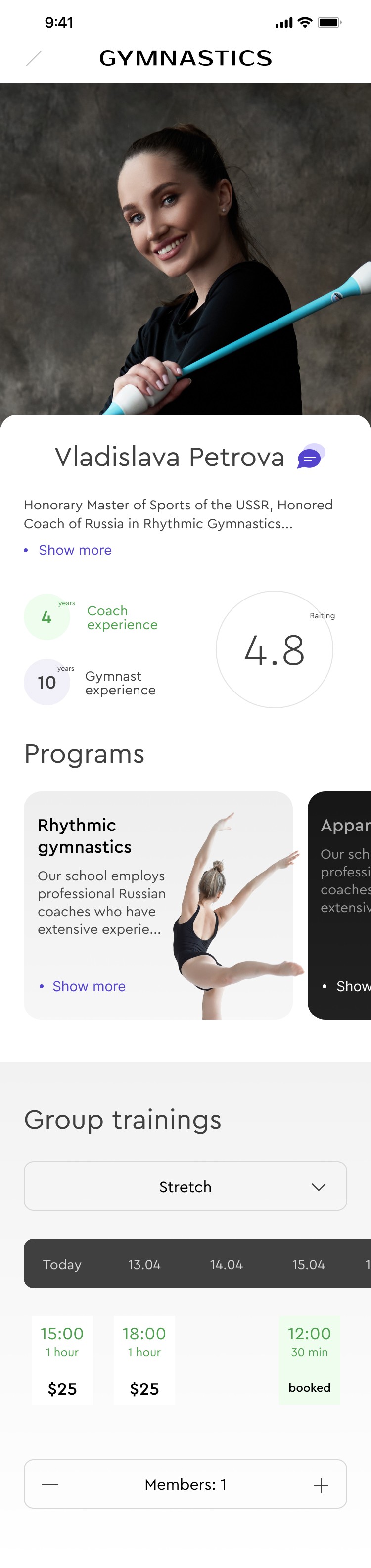 Проект позволяет записаться на индивидуальные и групповые занятия по гимнастике, йоге и некоторым другим дисциплинам.